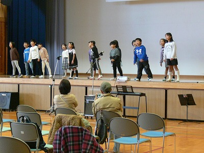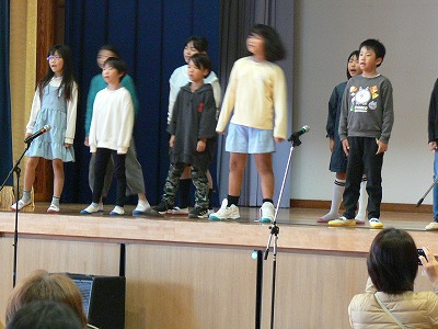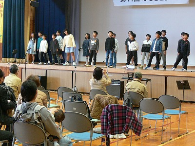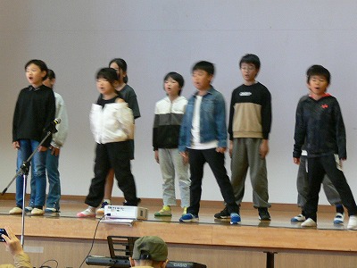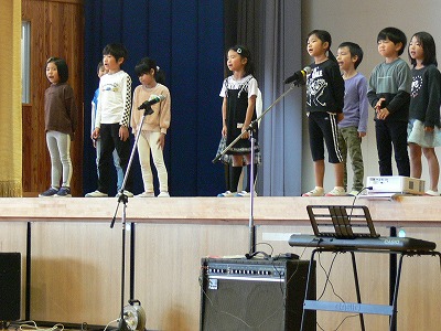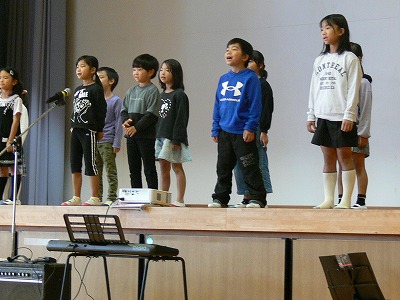 11月3日月曜日、文化の日に、土肥集学校(旧土肥小学校)で行われた第11回ふるさと祭りに、土肥小中一貫校1~4年生の有志が参加しました。桜翔祭音楽の部で発表した合唱、「エール」(1,2年生)と「南風にのって」(3,4年生)を披露しました。元気のよい歌声で会場を盛り上げました。