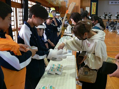 9年生は、とびうお学習の一環で「ほわっとびわ石鹸」の販売体験を行いました。自分たちで製品のパッケージを考え、売り方もグループで工夫を凝らしました。販売してお金を稼ぐという体験から、将来について考えることと並行して、土肥の特産品であるびわを使った製品にふれることで、土肥の可能性について改めて考える機会となりました。