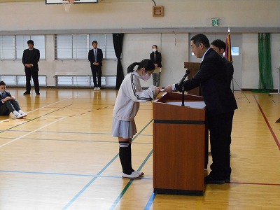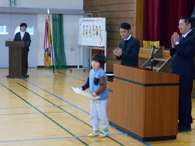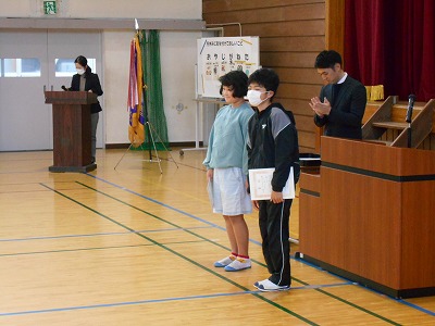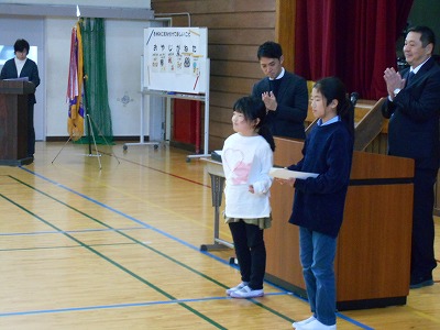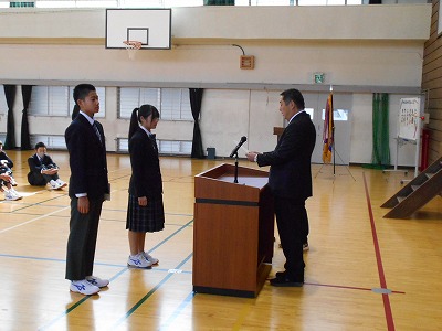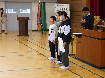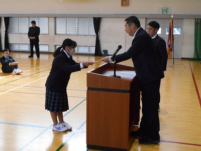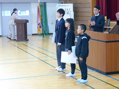 12月23日火曜日は2学期の終業式でした。様々な行事のあった81日間の2学期を終え、13日間の冬休みが始まります。終業式では、1年生と5年生、7年生の代表が2学期のふり返りを発表しました。どの子も原稿を見ずに自分の言葉で発表しました。校長先生からは、サッカー長友選手の言葉を例に、挑戦する気持ちをもつことについてお話がありました。終業式後は表彰を行いました。たくさんの頑張りが見られた2学期を象徴する表彰となりました。