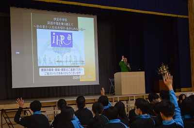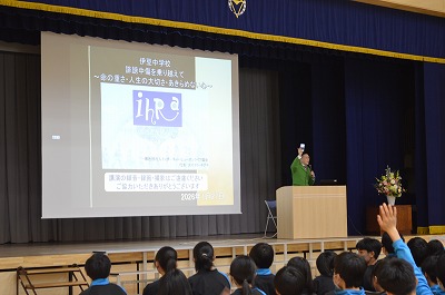 1月27日火曜日に、8年生が実学講座に参加しました。伊豆中学校で開催された講座には、スマイリーキクチさんが講師で登壇しました。「誹謗中傷を乗り越えて~命の重さ、人生の大切さ、あきらめない心~」を演題に、「人との関わり方」や「言葉の力」について話を聞きました。講師のスマイリーキクチさんのお話は、日常の何気ない行動を振り返るきっかけになりました。「自分だったらどうだろう」「普段の言葉や行動はどうだっただろう」と、一人一人が自分と向き合い考える時間になったと感じています。