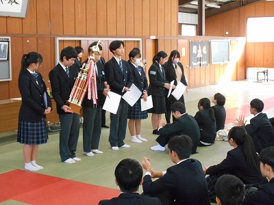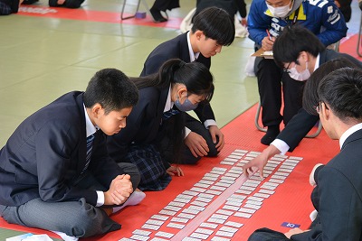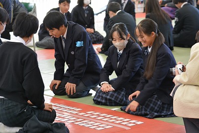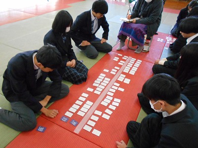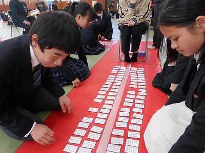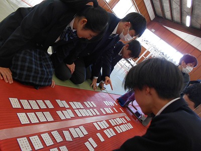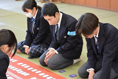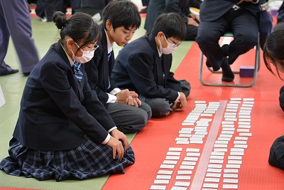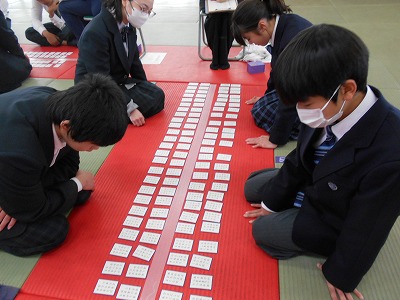 始業式後、7、8、9年生は、伊豆総合高校土肥分校と合同で、新春恒例の百人一首大会を行いました。各校でそれぞれチームを編制し、源平戦ルールにのっとってチーム対抗で勝敗を競いました。上の句の途中で取り札をとり喜ぶ姿があれば、目の前の札に気付かず相手にとられ天を仰ぐような姿があり、一進一退の好勝負が続きました。熱戦を制した9年生チームが優勝し、1年間優勝トロフィーを一貫校で預かることになりました。
